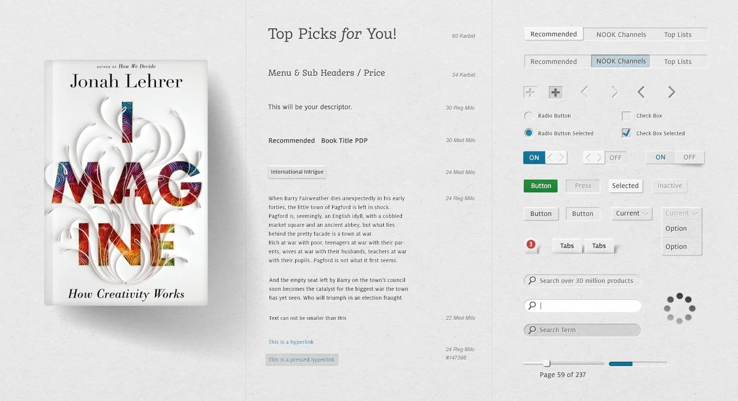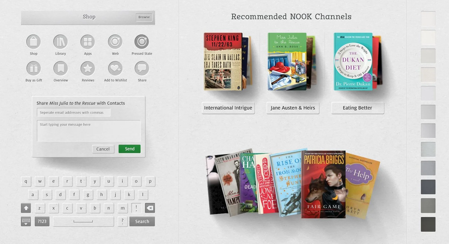 The UI needed to convey that textured coziness, reminding you that you were reading a book coming from a bookstore, not a lifeless digital facsimile. This was touch interaction, an early one at that, and it was important to bring to the experience something different than what was available elsewhere, something inviting. I brought in organic shadows, stacks and splays for grouped content reminiscent of coffee tables, and spines to books and gloss shimmers to magazines. Most UI cut into the ubiquitous texture other than the primary CTAs, adding more contemporary brightness.