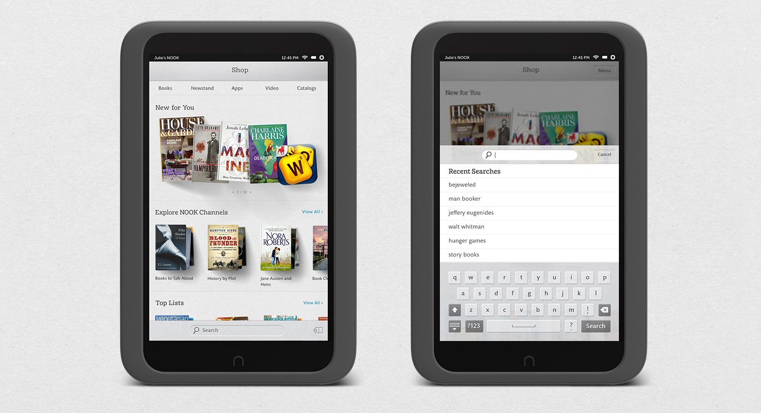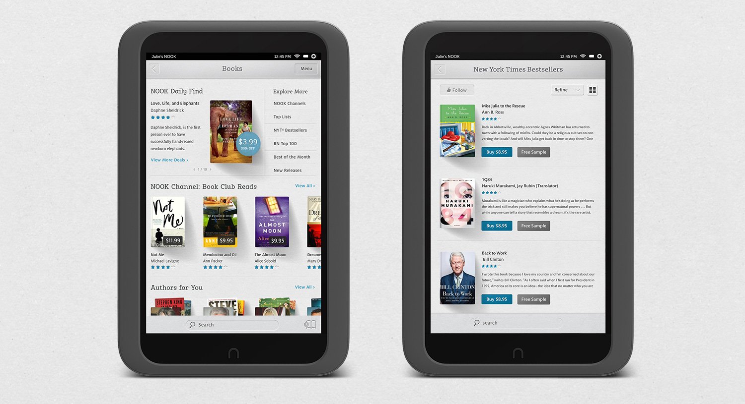 There are few other brands for which I have such an affinity. So when I had the opportunity to work at B&N, it felt like an opportunity to give back. I joined the team building out a complete overhaul of their Nook line of devices readying for a new launch, working on the design system and how it would be applied to the OS and core suite of applications.